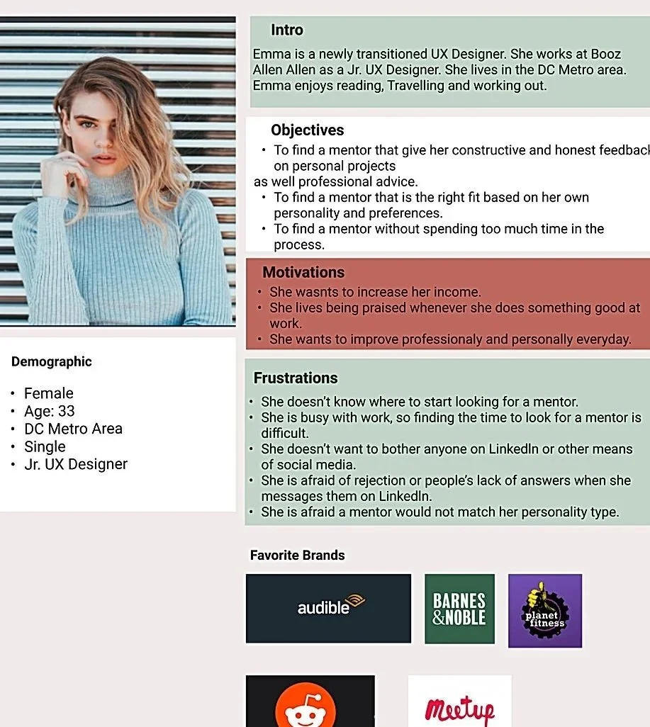 Emma represents early-career designers seeking personalized guidance, emotional support, and efficient access to mentorship. This persona was derived from key user research insights and informs matching, onboarding, and communication features.